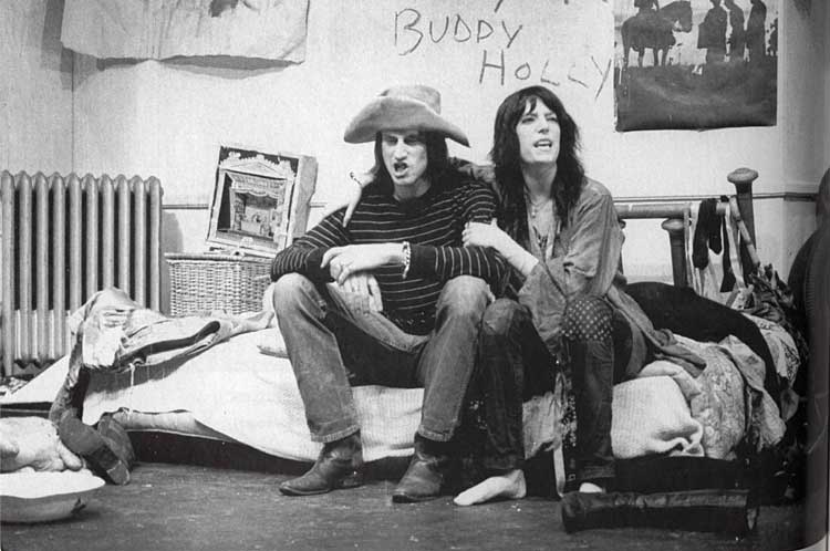 The same image will close the play, but with a whimper, and not with Slim pulling the trigger. Though Cavale is quick to diminish its impact (“it don’t mean nothing, it’s just a neat story” 89) the metaphor for suicide as escape becomes her recurrent trope—escape being what Cavale, her self-chosen name, comes to signify at the very close of action. Not just hers, but deeply enmeshed in the rock archetype she’s seeking to perpetuate. Cavale’s savior, we see, is a gentle Jesus, who is meant to survive, but that other ‘saviour’, outside the frame of Cowboy Mouth, is the one Smith knows and draws on: were Buddy Holly, Hank Williams, Richie Valens, even Robert Johnson, and their more contemporary company cited above, suicides or accidents? (Note also the still photographs from the original American production published in the Winter House edition (1972). On the wall behind Shepard and Smith sitting on the “fucked-up bed” in the title roles, Buddy Holly has been prominently scrawled; and the mise-en-scène calls for “Photographs of Hank Williams and Jimmie Rodgers”, 85).